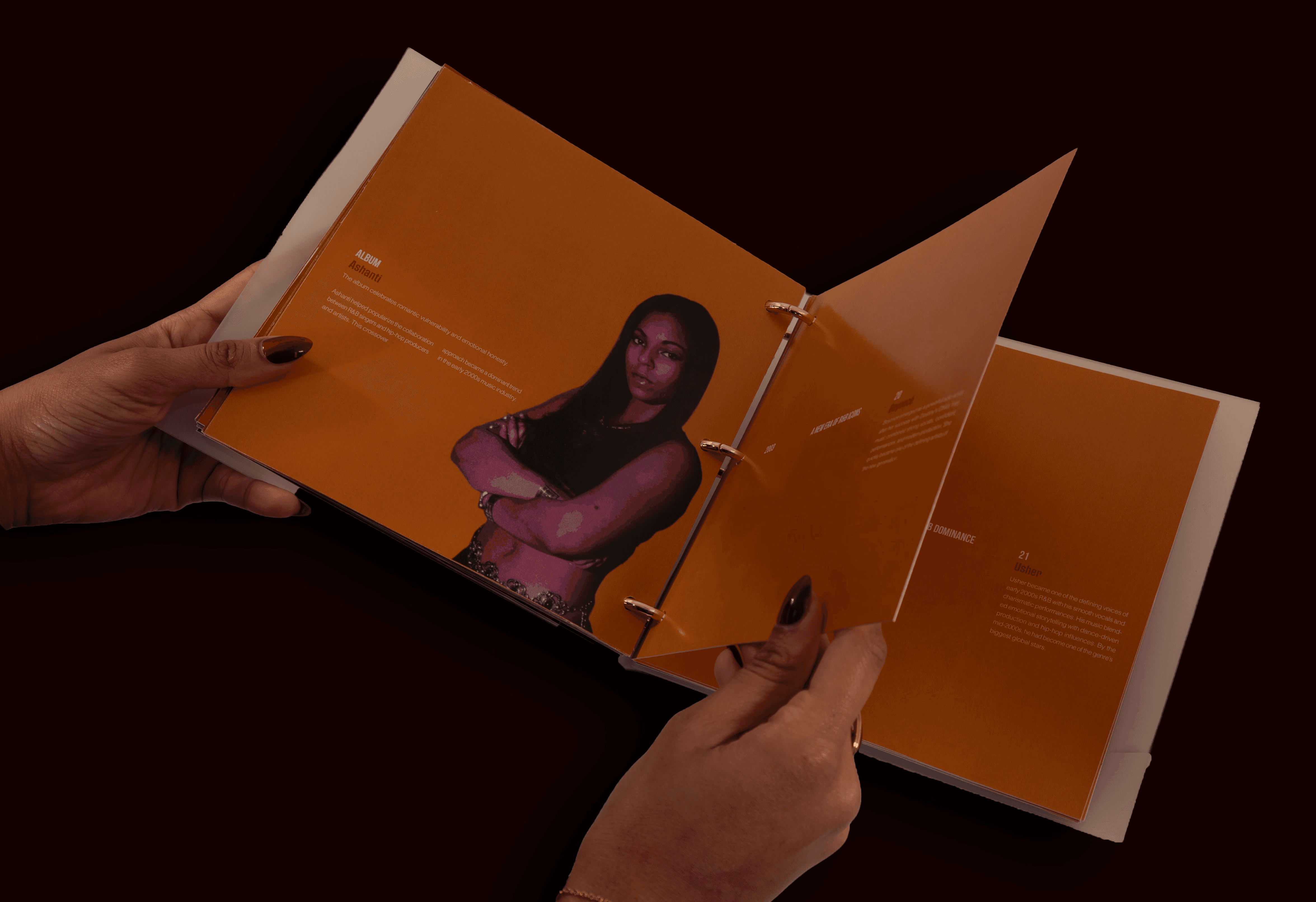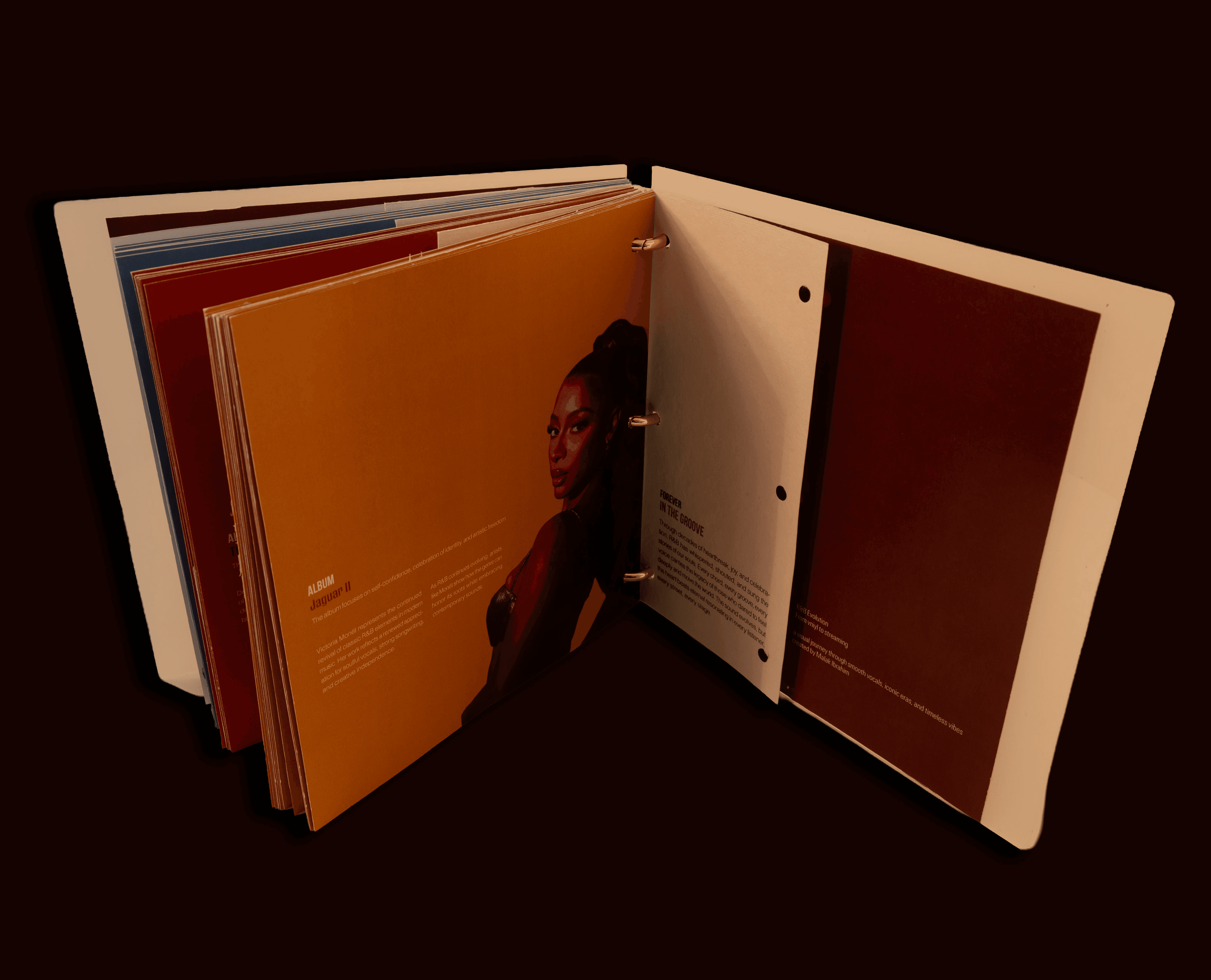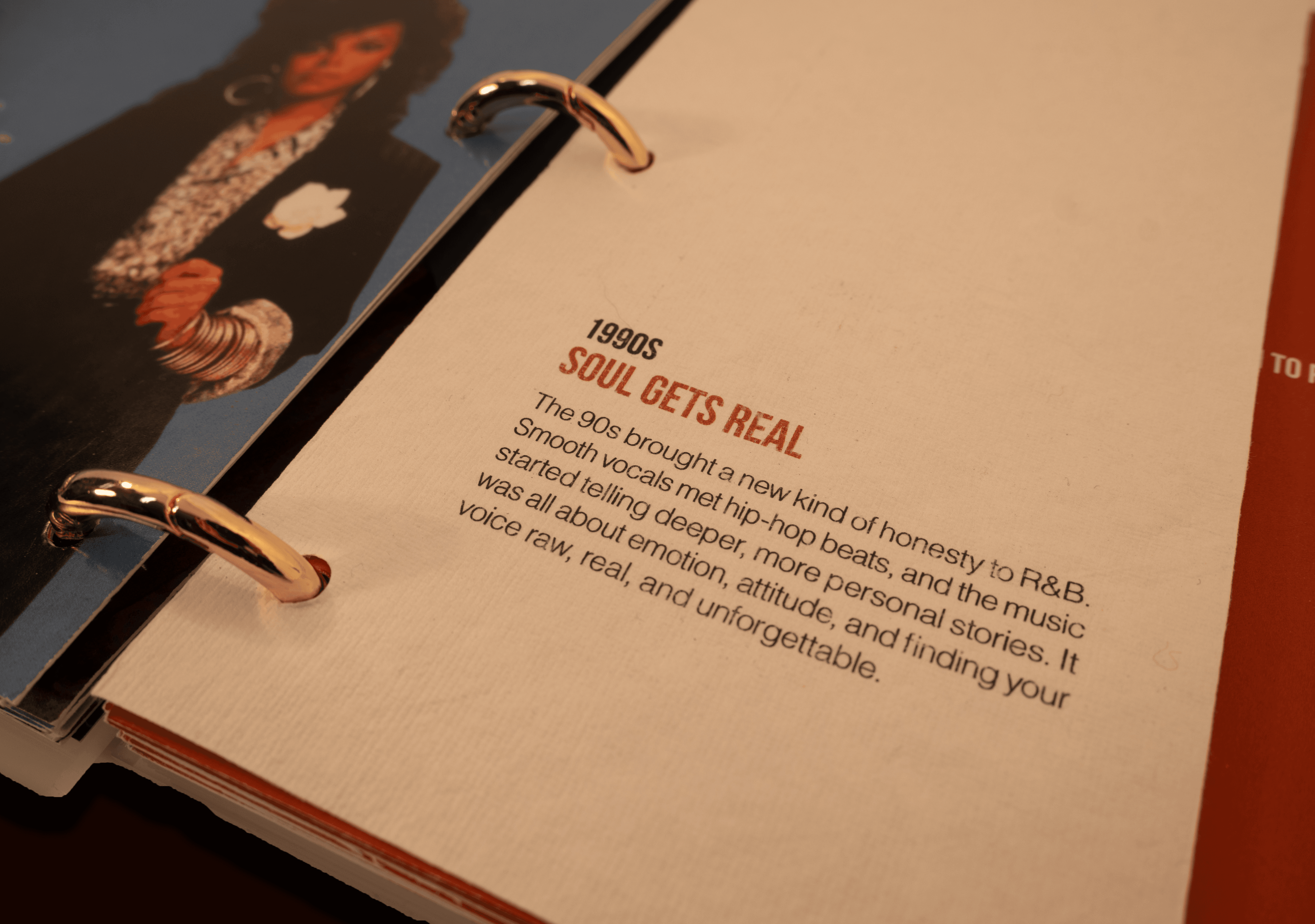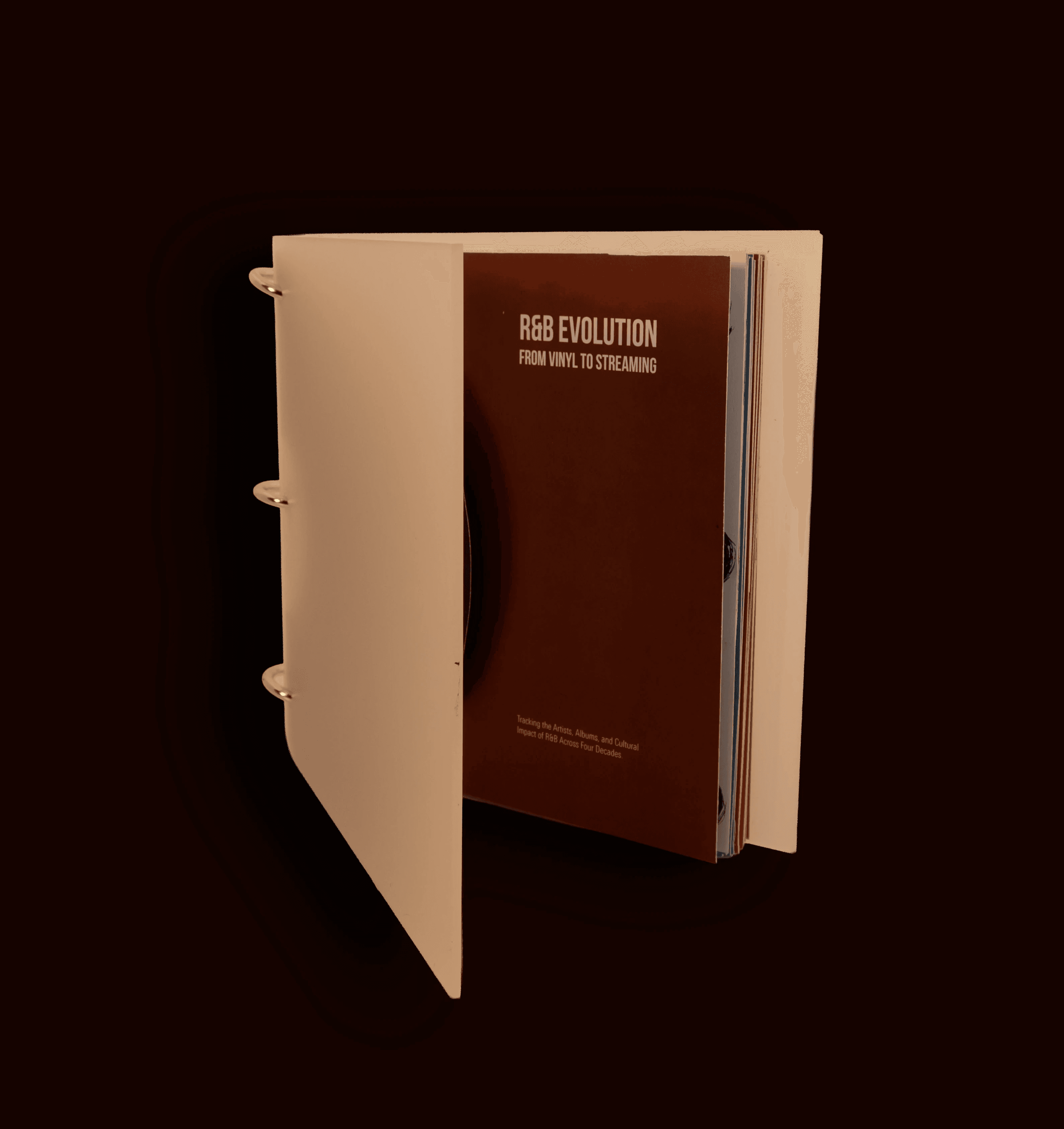 This artist book explores the evolution of R&B from the 1980s through the early 2000s, using a color-driven narrative to reflect each decade’s identity, blue for the smooth, foundational sounds of the 80s, orange for the expressive and genre blending energy of the 90s, and yellow for the bold,